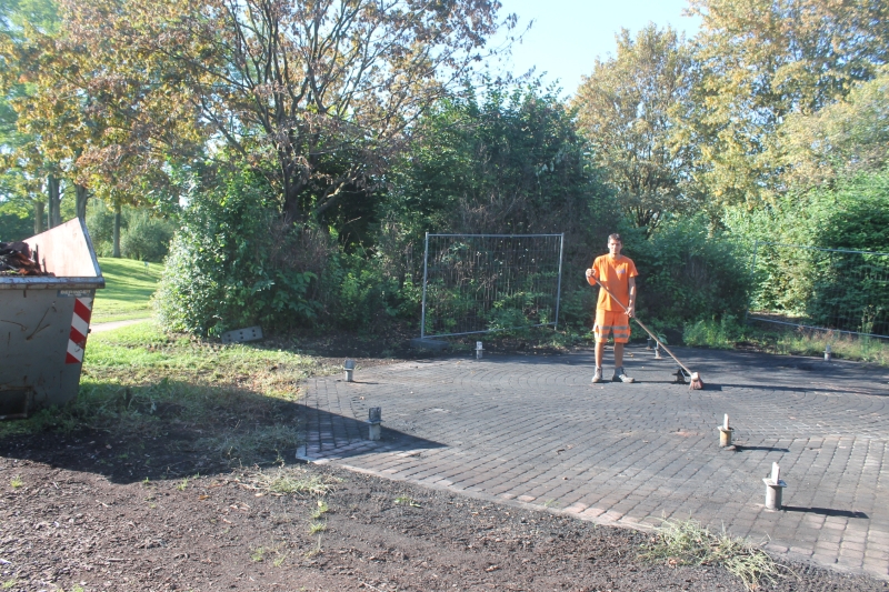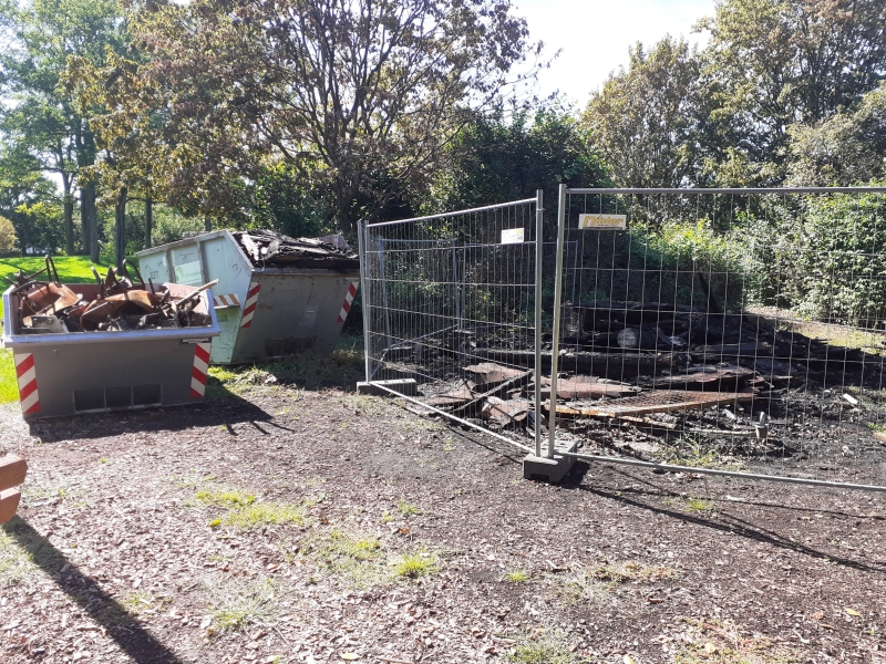 Endlich sind die verkohlten Reste des Forstpavillons beseitigt. Urlaub und Ferien, sowie der Umgang mit „Sondermüll“ und Angebote Einholung haben Zeit gekostet.