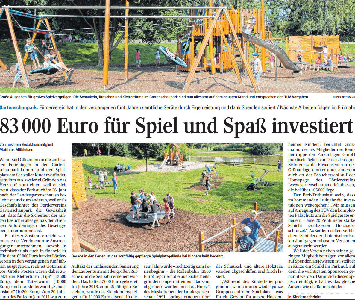 "Der Förderverein Gartenschaupark hat in den letzten Jahren schon viel in den beliebten Kinderspielplatz investiert und Tipi, Tatzelwurm sowie Kletterwand mit Hilfe der Mitgliedsbeiträge und Spenden angeschafft".