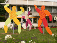Drei neue Skulpturen von 18 Schülerinnen und Schüler der 6. und 7. Jahrgangsstufe machen den Eingangsbereich zur Lamellenhalle des Gartenschauparks lebendig und farbenfroh.